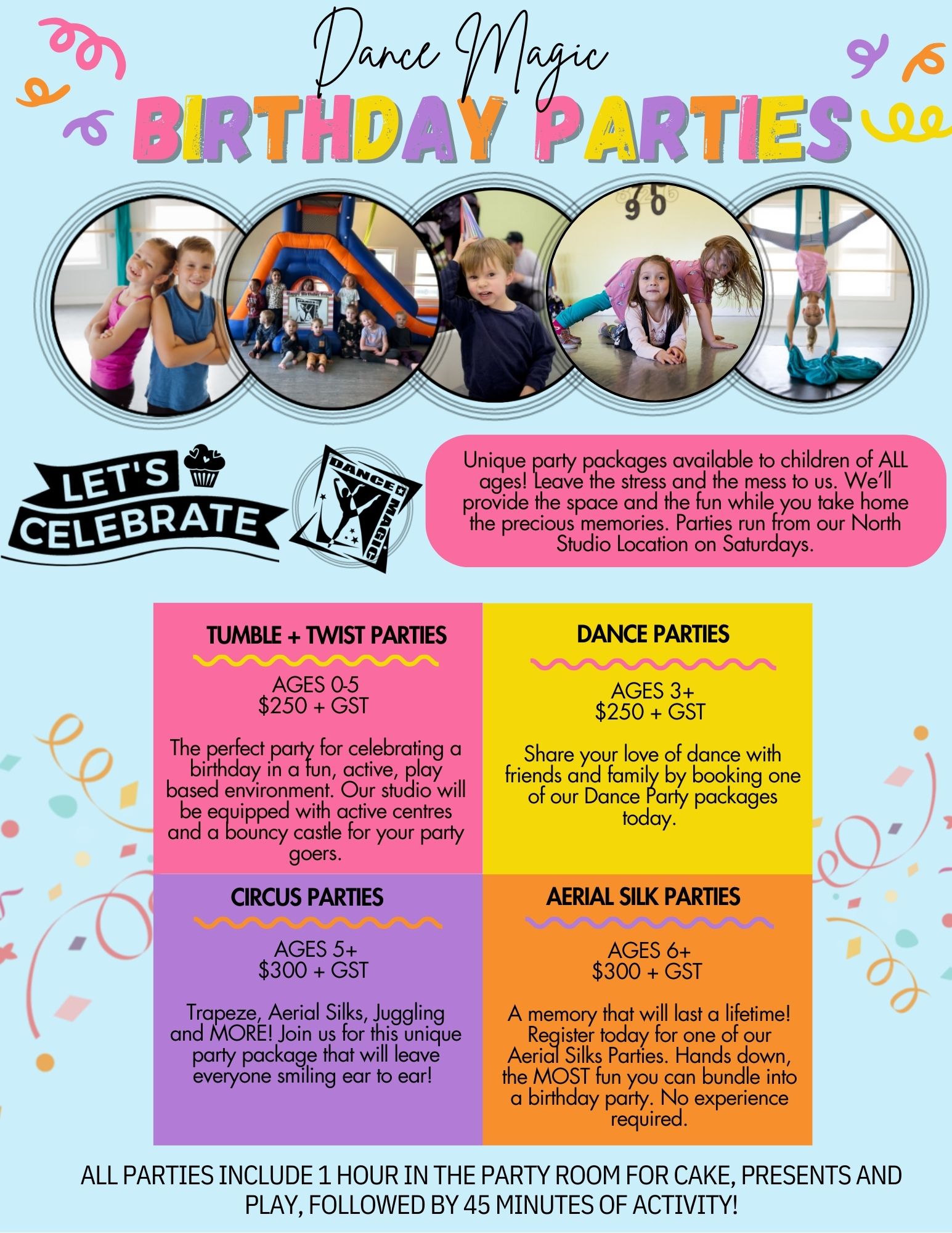 Dance + Tumble + Twist Parties = $250 + GST