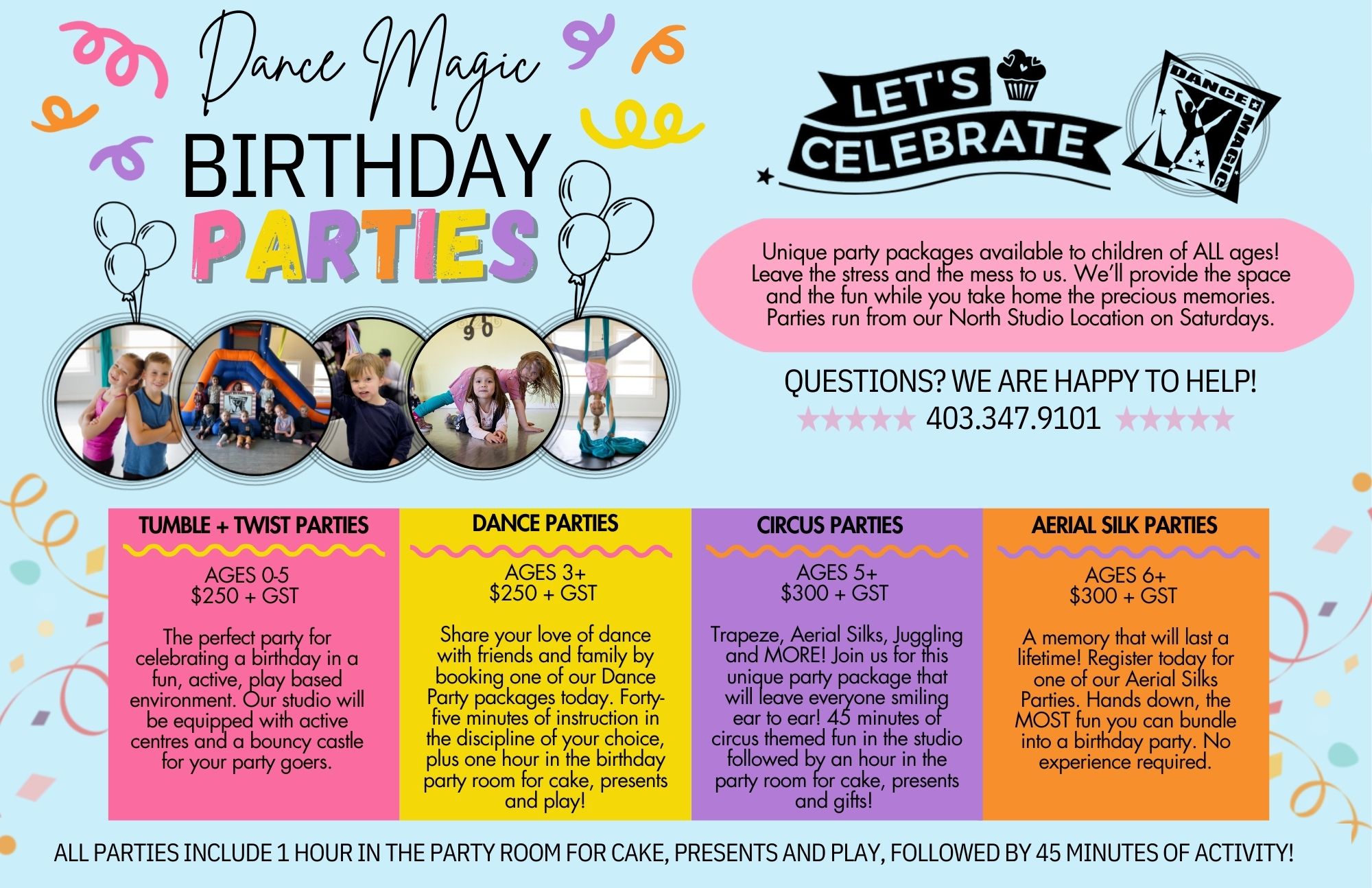 A friendly reminder: All parties will show as $300 + GST upon booking. If you are booking a DANCE or TUMBLE + TWIST Party $50 will be taken off your total prior to your credit card being charged